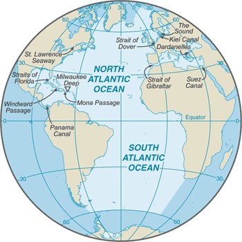 major chokepoints include the Dardanelles, Strait of Gibraltar, access to the Panama and Suez Canals; strategic straits include the Strait of Dover, Straits of Florida, Mona Passage, The Sound (Oresund), and Windward Passage; the Equator divides the Atlantic Ocean into the North Atlantic Ocean and South Atlantic Ocean -