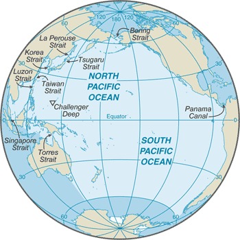 The Pacific Ocean is the largest of the world's five oceans (followed by the Atlantic Ocean, Indian Ocean, Southern Ocean, and Arctic Ocean). Strategically important access waterways include the La Perouse, Tsugaru, Tsushima, Taiwan, Singapore, and Torres Straits.The decision by the International Hydrographic Organization in the spring of 2000 to delimit a fifth ocean, the Southern Ocean, removed the portion of the Pacific Ocean south of 60 degrees south. -